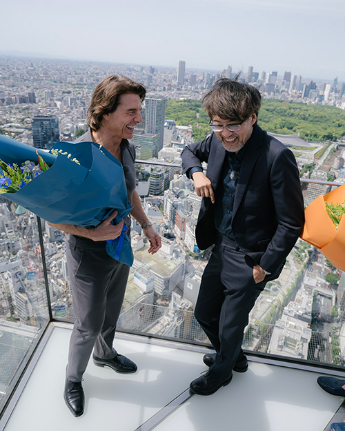 この日、トム・クルーズが山崎貴監督と待ち合わせたのは、世界中から観光客が集まる日本を代表する観光地《渋谷》を一望できる場所、渋谷スクランブルスクエアの屋上展望台《SHIBUYA SKY》。圧巻の景色が広がる空の舞台で、二人は笑顔を交わし、固く握手をしました。開口一番に「あなたの大ファンだ!素晴らしい作品ばかりだ」とラブコールを送るトムから、彼がどれほどこの瞬間を待ち望んでいたかが伝わってきます。実はこの二人、過去に大きな繋がりがあります。昨年、第96回アカデミー賞🄬で『ゴジラ-1.0』が視覚効果賞を受賞するという快挙を成し遂げたとき、同じく視覚効果賞にノミネートされていたのが、シリーズ前作の『ミッション:インポッシブル/デッドレコニング』でした。